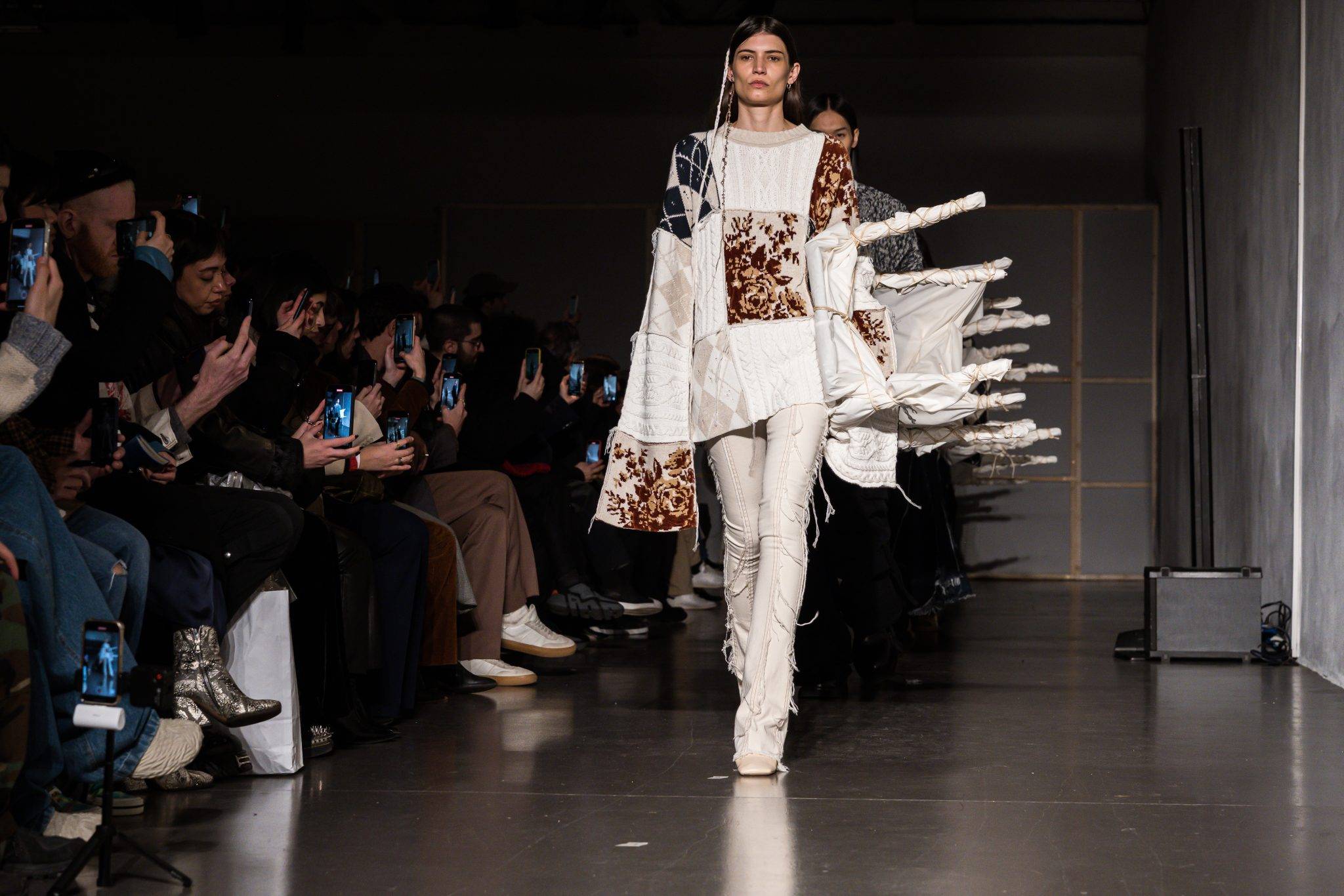 “La casa è il vostro corpo più grande. Vive nel sole e si addormenta nella quiete della notte; e non è senza sogni”, diceva Khalil Gibran. E per Federico Cina la casa è dove si sta bene. La collezione fall-winter 2023, intitolata “Appartamento”, è un personalissimo spazio di evasione. Andato via dalla sua Romagna, Federico Cina ha girato il mondo, ma torna nella sua terra natia. Una sfilata che ha il sapore della partenza, ma anche del ritorno. Così il creativo ricuce il presente con il passato. “Sono nato nel posto sbagliato”, aveva dichiarato. Ma quello che un tempo sembrava un luogo errato, oggi non lo è più. E diventa tutto. I capi sono componibili e modulabili, presente la maglieria con patchwork ispirati a vecchie coperte, tappeti e tendaggi tipici delle case d’infanzia. La palette di colori è neutra e terrosa e rispecchia il calore di quegli spazi. I capi si compongono e si scompongono, coprono e scoprono. Proprio come quando costruiamo il nostro personale rifugio. Ad assistere allo show amici del marchio tra cui Michele Bravi, Salvo Rizza e Aya Mohamed.