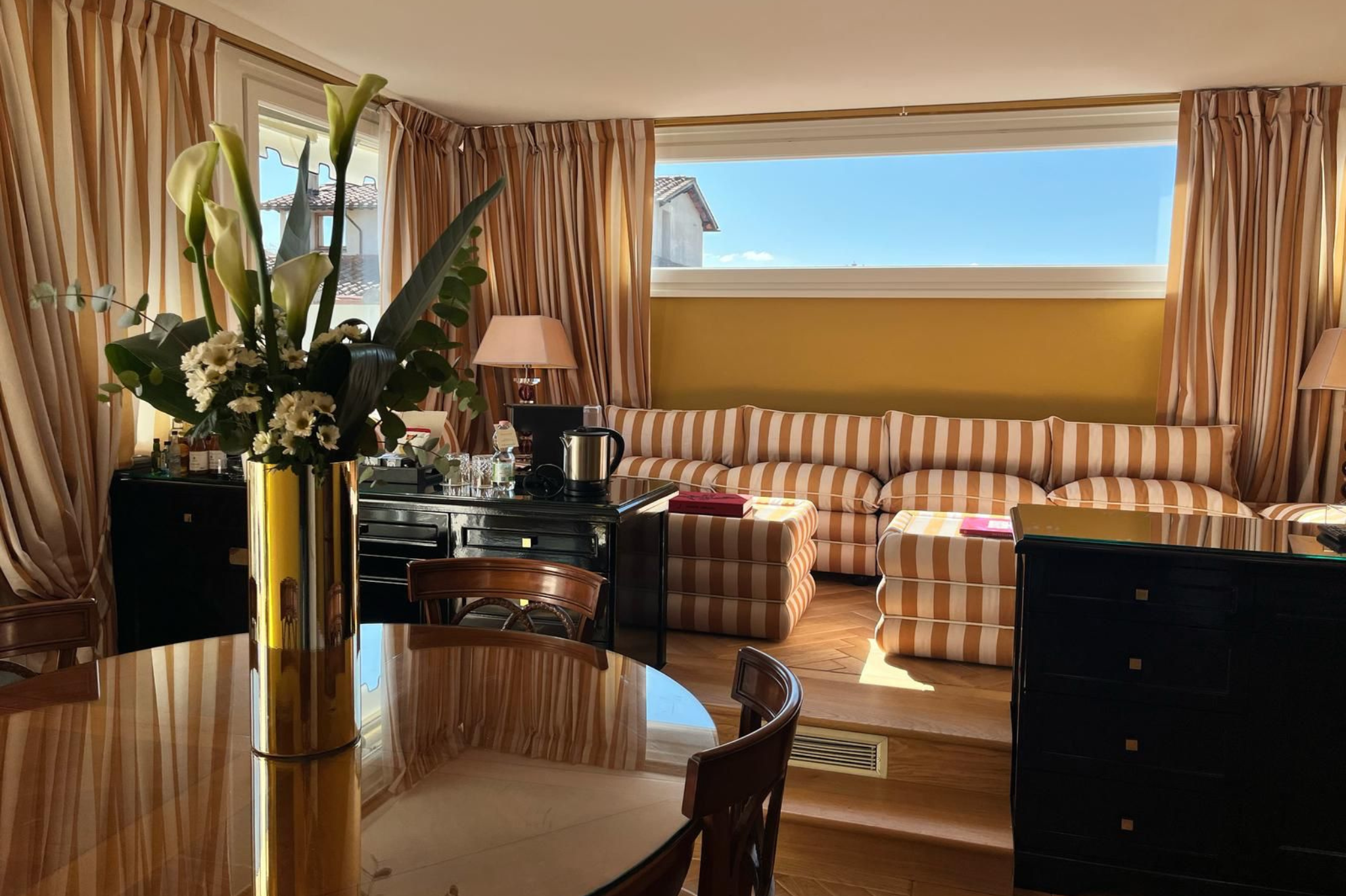 Le nuove suite offrono una vista mozzafiato su Firenze, dai monumenti iconici come la cupola del Brunelleschi al Palazzo Vecchio. Ogni dettaglio delle suite è realizzato da artigiani fiorentini: mobili in ottone, tavolini in scagliola e specchi anticati, un omaggio alla tradizione locale. La Suite 560 (66 mq) e la Suite 550 (74 mq) vantano arredi di alto livello, unendo l’eleganza dell’ala Helvetia con il design sofisticato dell’ala Bristol.
